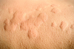Urticaria (hives) are localized, pale, itchy, pink wheals (swellings) that can burn or sting. They may occur singularly or in groups on any part of the skin; they are part of an allergic reaction and are very common. Approximately 10-20 percent of the population will have at least one episode in their lifetime. Most episodes of hives disappear quickly in a few days to a few weeks. Occasionally, a person will have them for many months or years. New hives may develop as old ones fade. Hives can vary in size form as small as a pencil eraser to as large as a dinner plate, and may join to form even larger swellings.